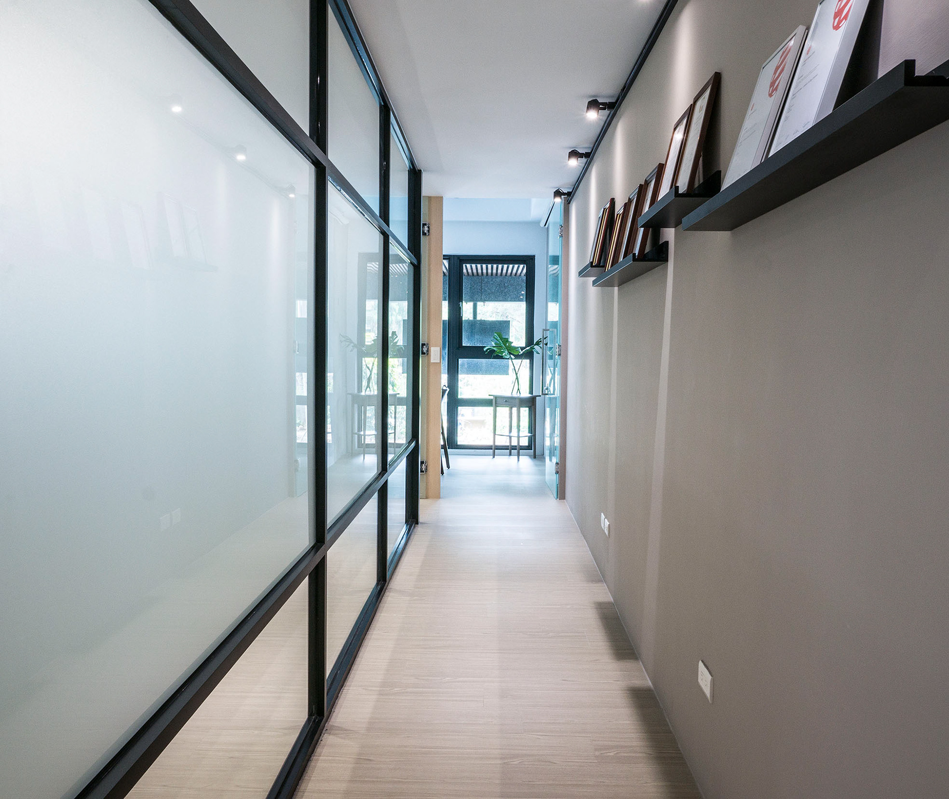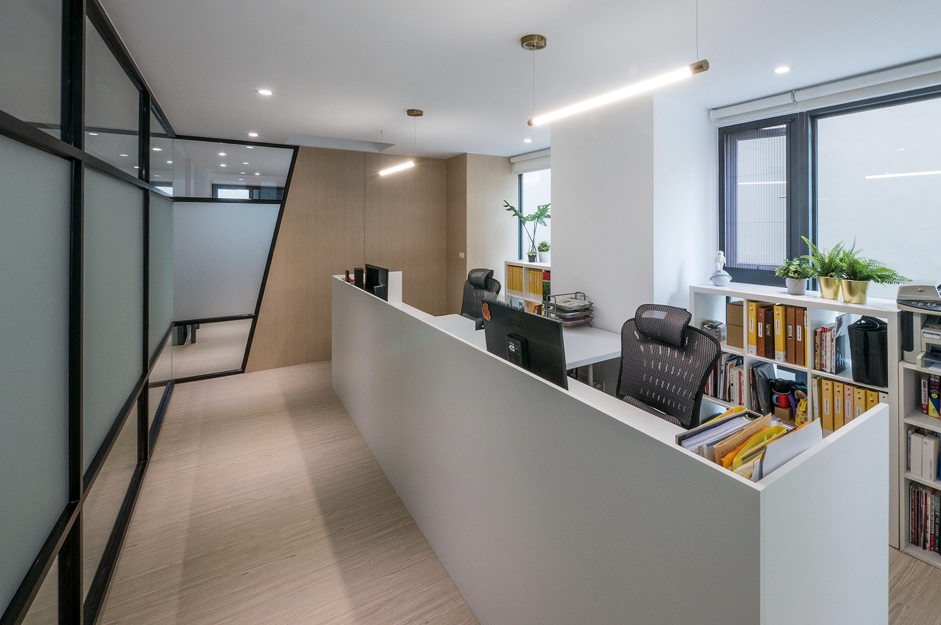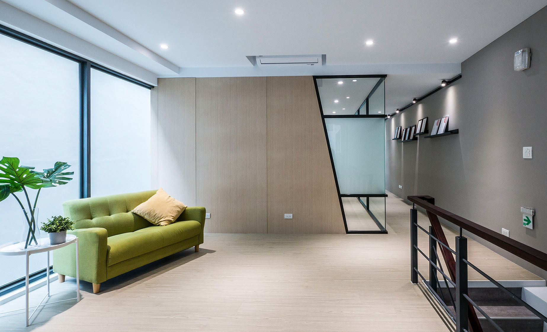 以企業色的基調作為色彩主軸,並將禾翌創意PH7的「7」轉化為造型元素,巧妙隱藏地套用在天花板以及玻璃隔牆上,默默地讓每一位共同奮鬥的夥伴們都能時時提醒自己公司創立服務的初衷。