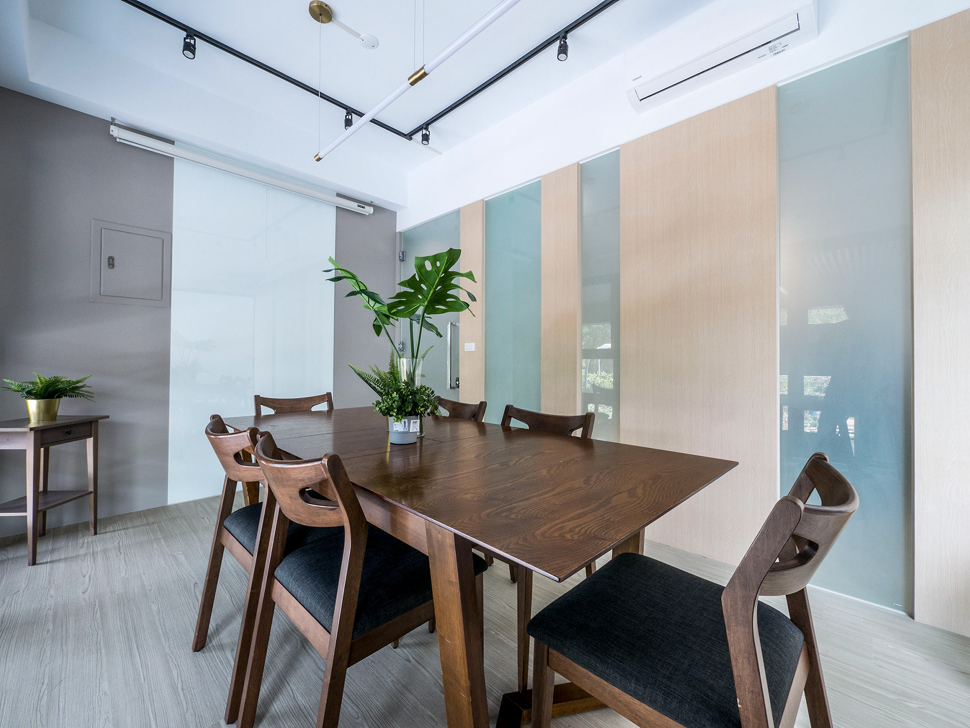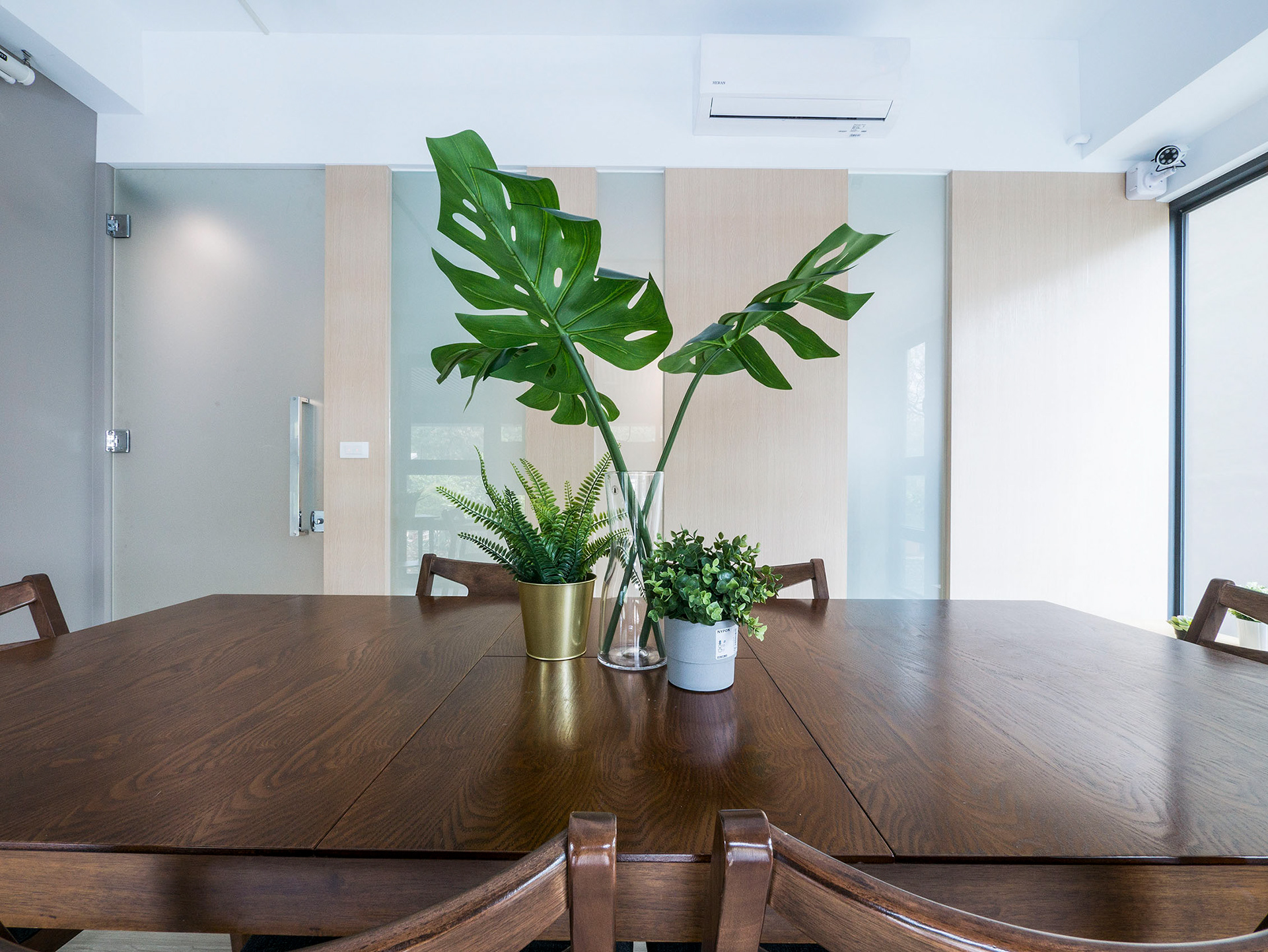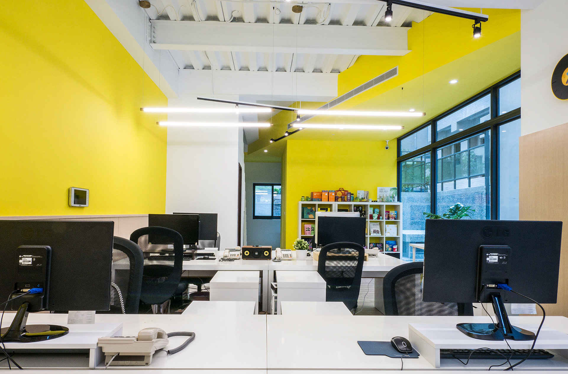 以企業色的基調作為色彩主軸,並將禾翌創意PH7的「7」轉化為造型元素,巧妙隱藏地套用在天花板以及玻璃隔牆上,默默地讓每一位共同奮鬥的夥伴們都能時時提醒自己公司創立服務的初衷。